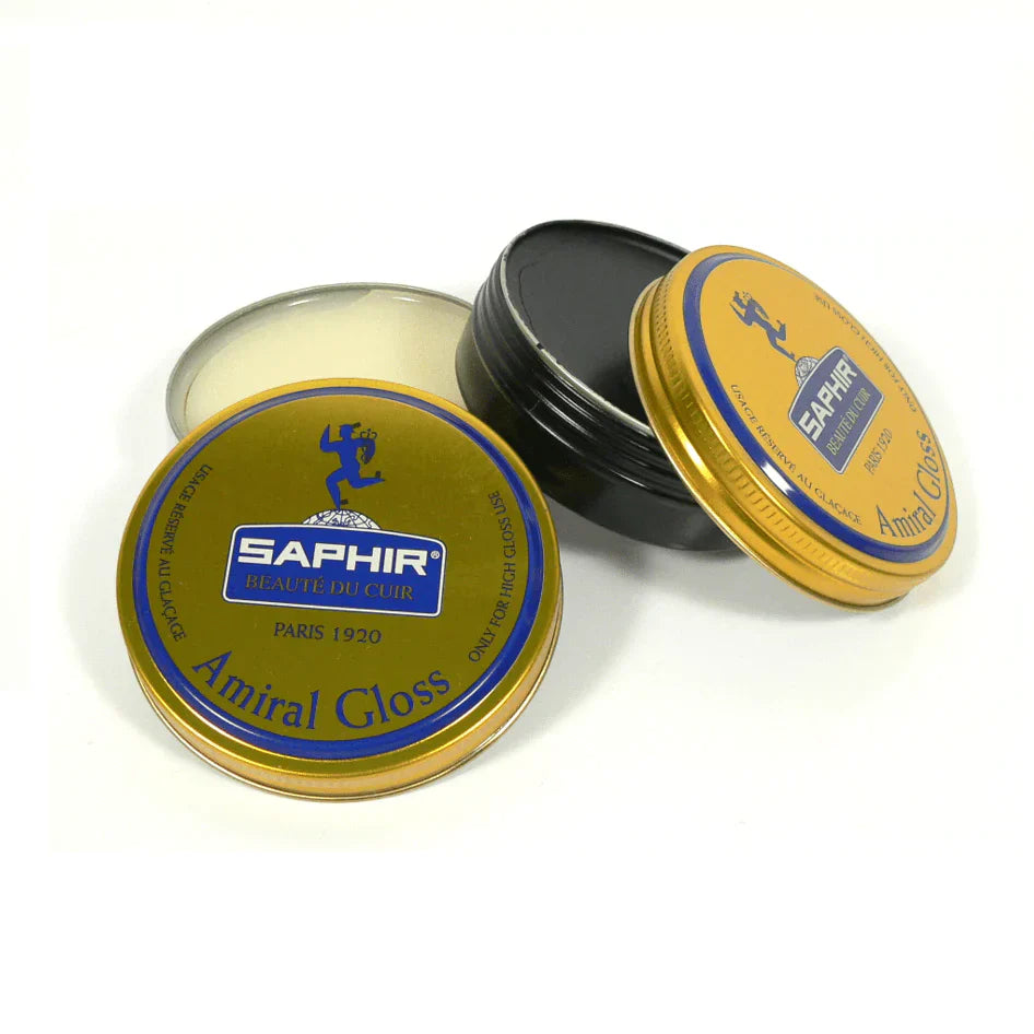 Amiral Gloss es un producto avanzado destinado a obtener un glaseado más rápido y fácil que con el simple uso de Pasta de lujo Saphir. Es posible obtener un brillo espejo con pastas regulares de Saphir, pero requiere un poco técnica más controlada para hacer el glaseado que el uso de Amiral Gloss formulado especialmente para este fin.
